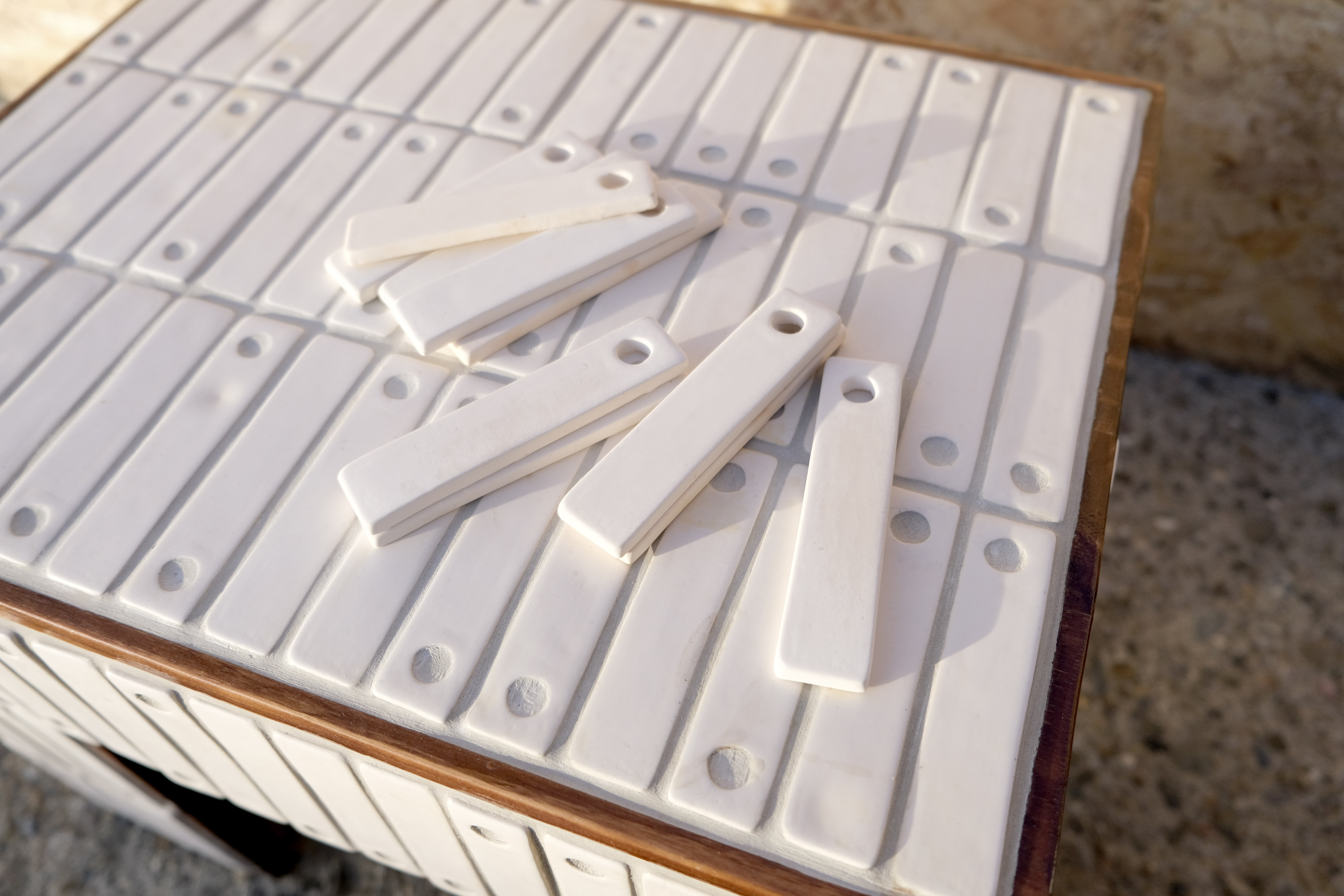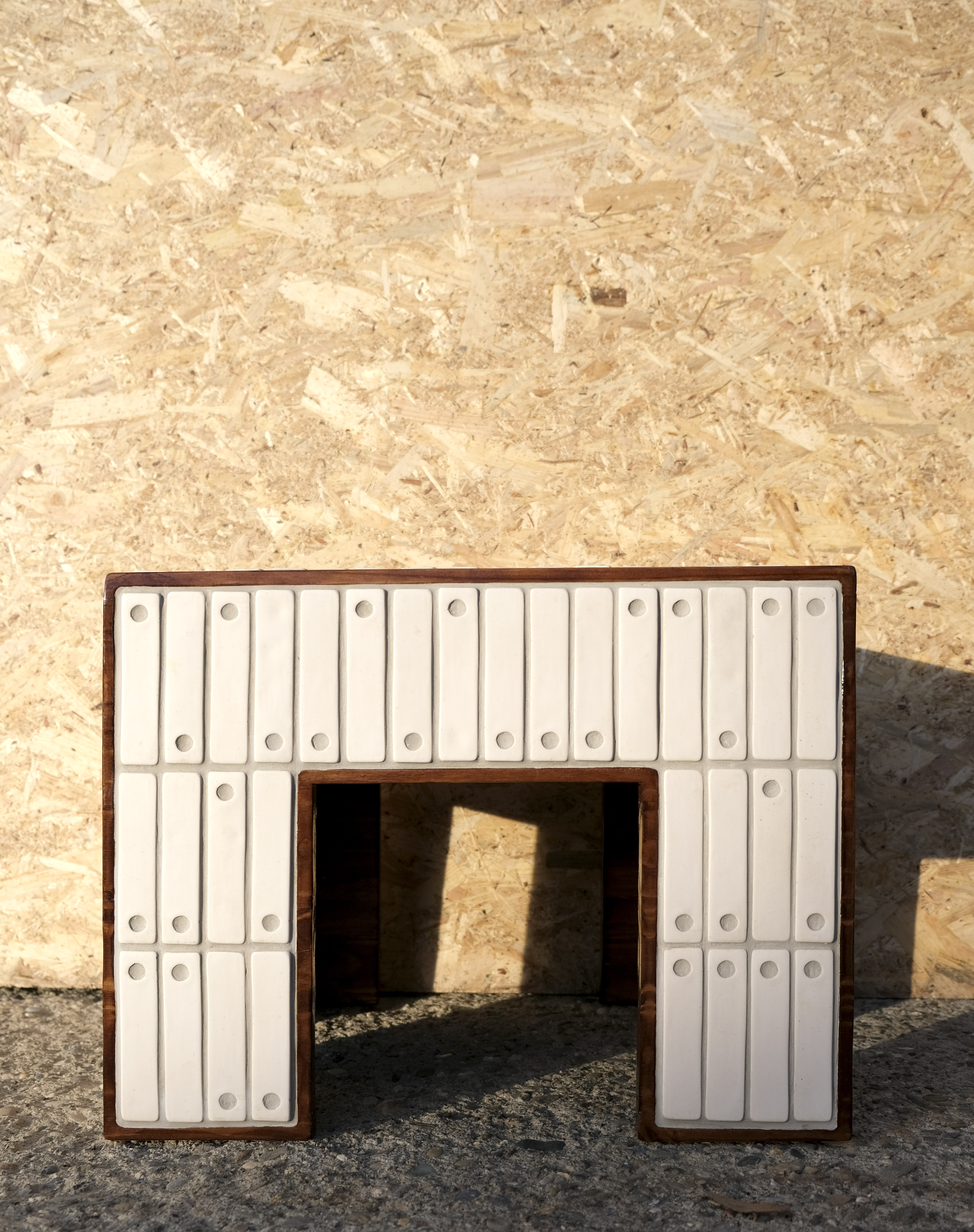 Bois de sapin teint et vernis, mosaïque en gypse et résine acrylique, joint ciment.