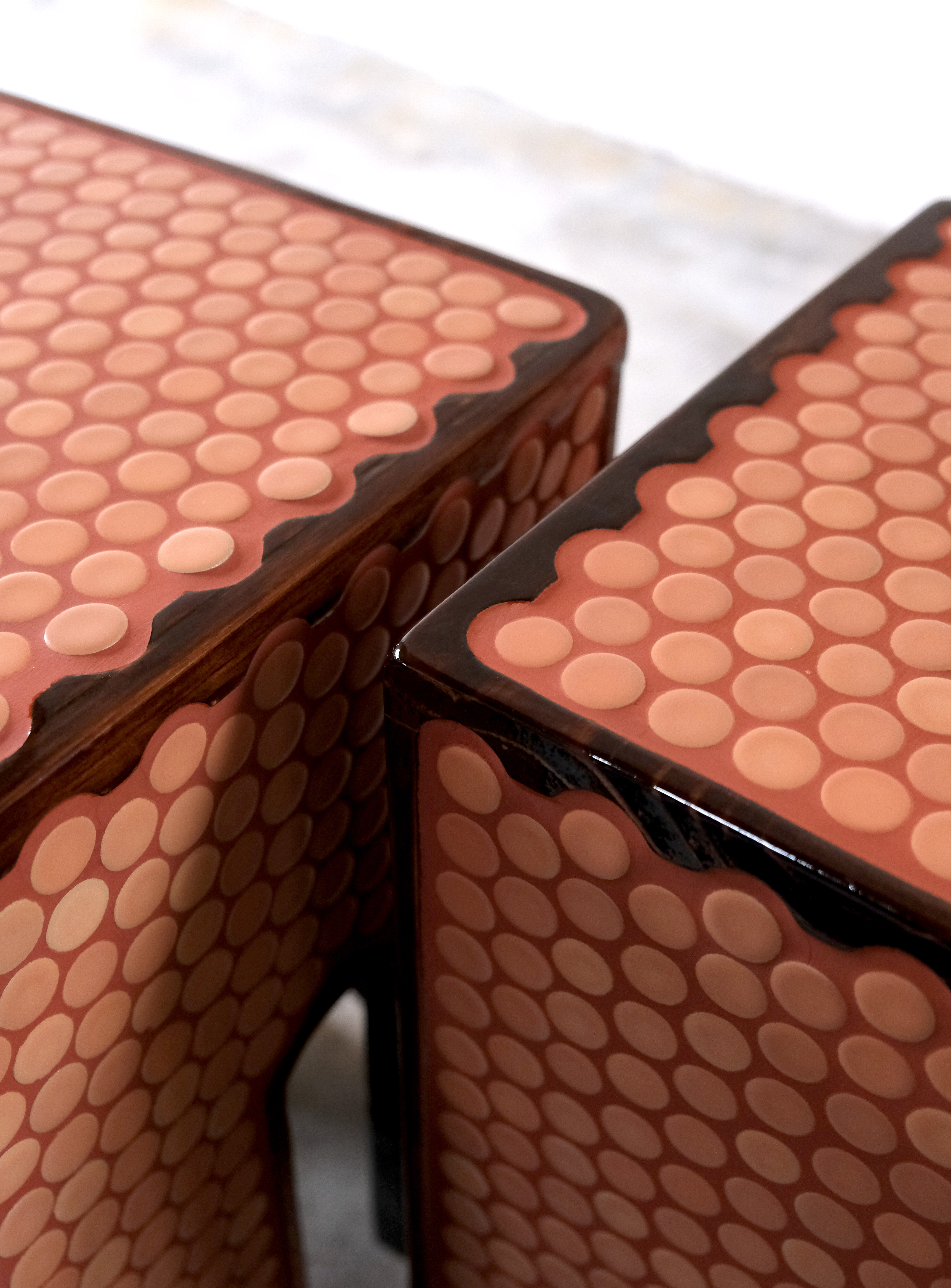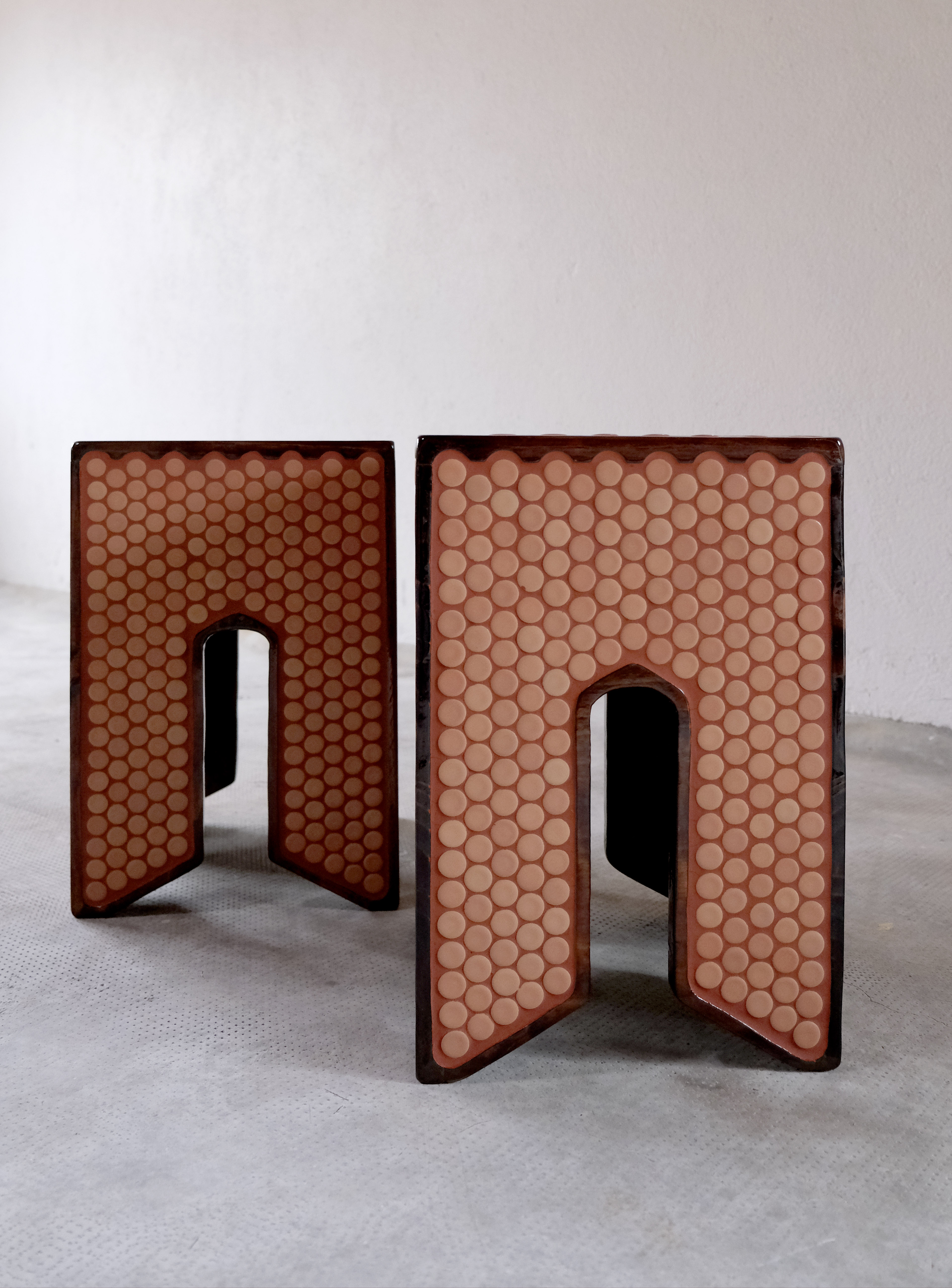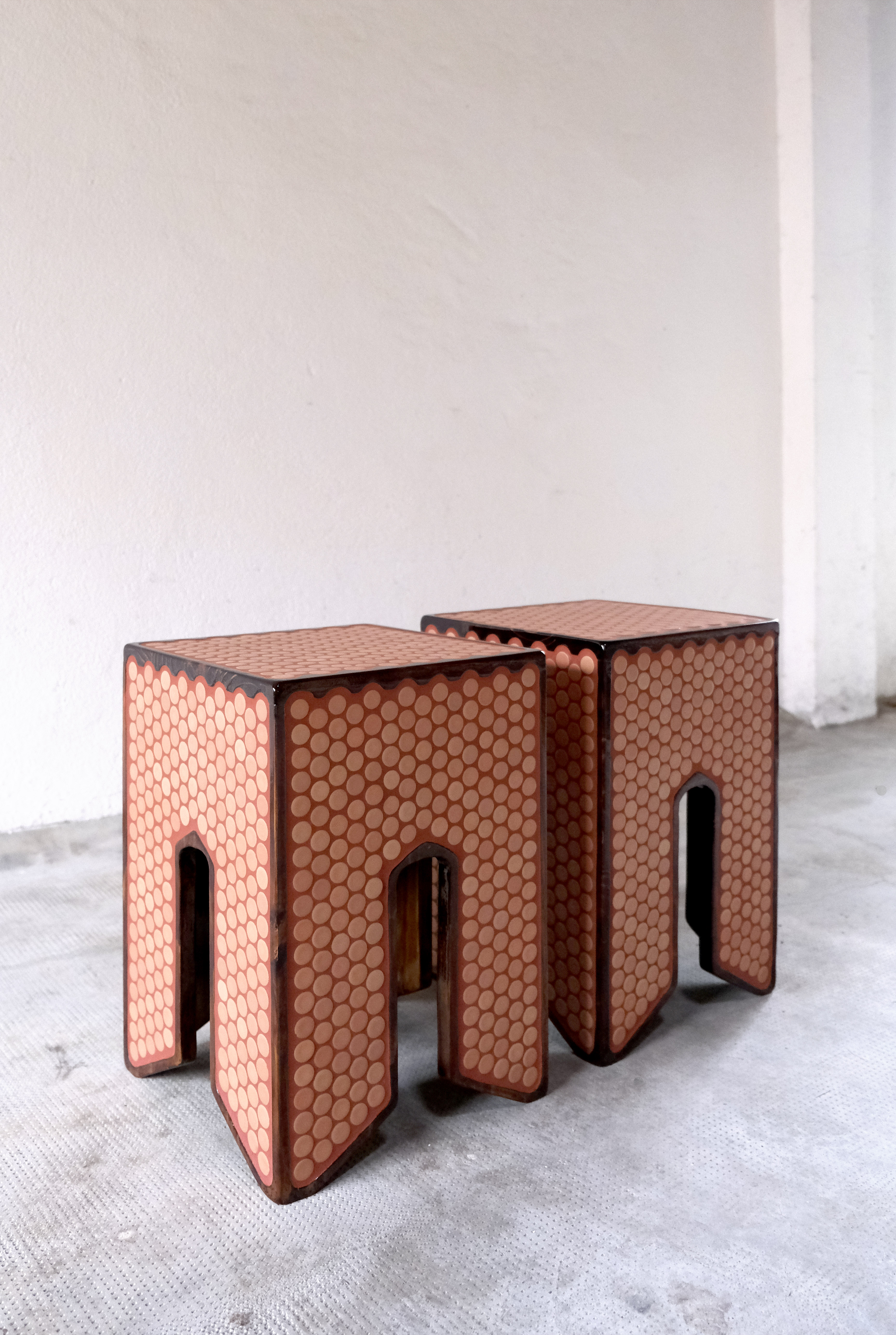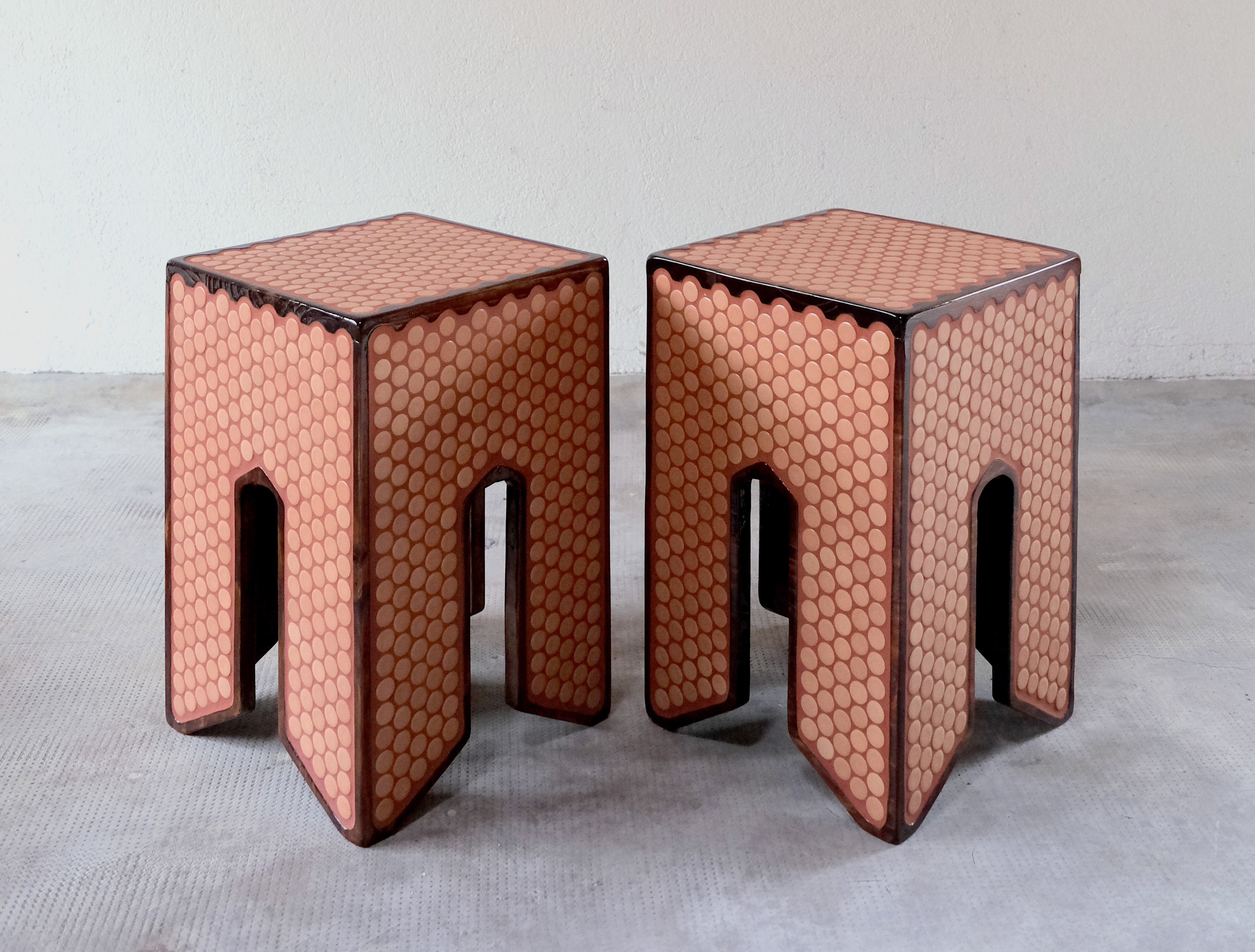 29 x 45 cm, bois de sapin vernis, carrelage, joint ciment teinté.