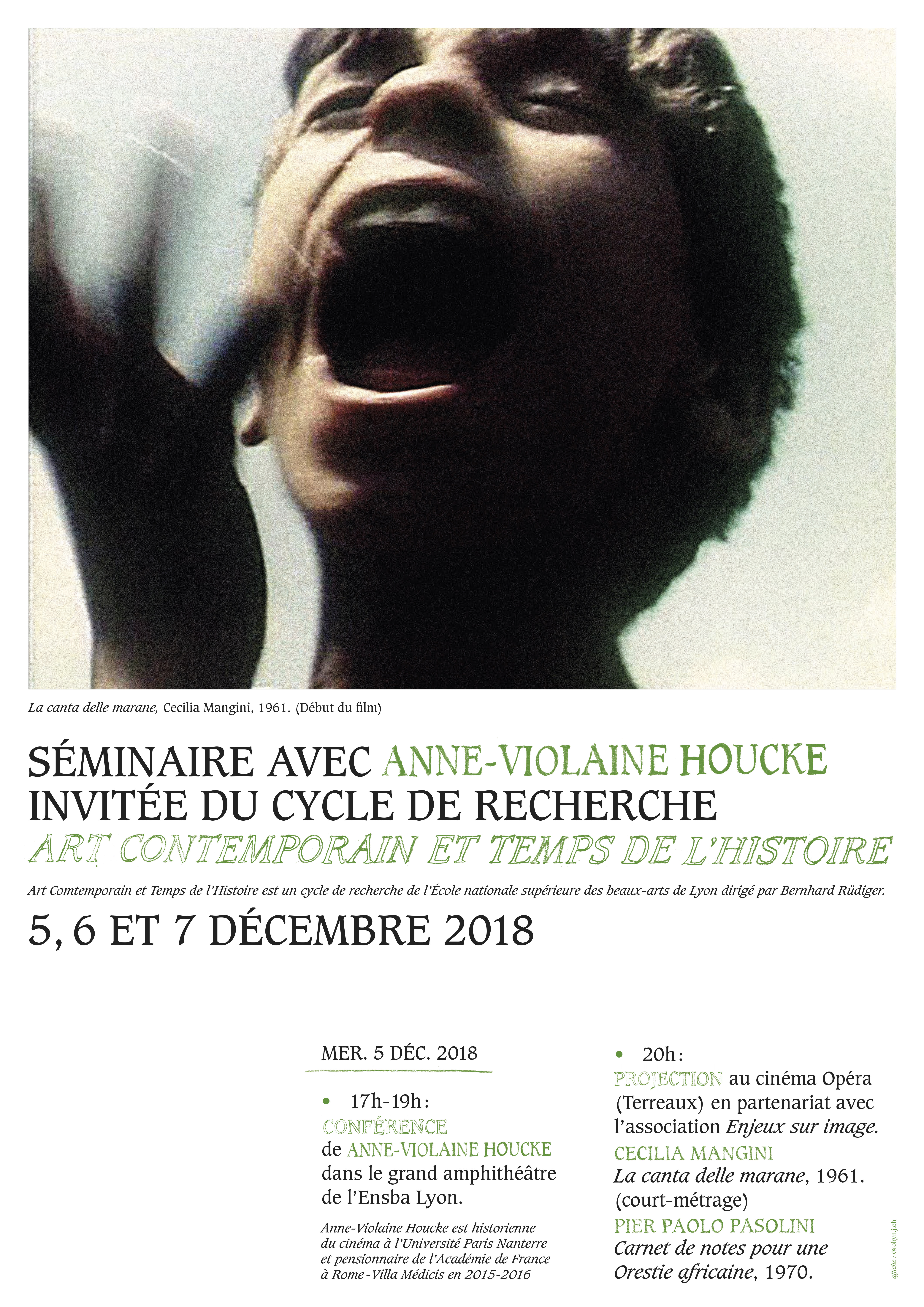 L'affiche a été réalisée à l'occasion d'un séminaire organisé par les étudiants du cycle de recherche A.C.T.H (art contemporain et temps de l'histoire) sous la direction de Bernhard Rüdiger. L’affiche donne la part belle à une séléction de captures d’écran issues du film de Cecilia Mangini, La canta delle marane (1961). Le grain des images entre en dialogue avec un re-travail manuscrit du caractère ITC Caxton dessiné par Leslie Usherwood.
